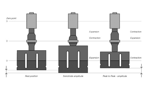 超聲波焊接機的加熱件為振動臂。振動臂由超聲波換能器、變幅桿和超聲波模具(焊頭)組成。振動臂以超聲波頻率收縮和膨脹。產生的振動為縱波。焊頭的振動,即峰值點和原始位置間的距離被稱為振幅 - 超聲波焊接時該數值在5μm和50μm之間。